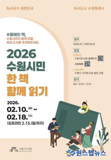 원스텝뉴스 이병희 기자 | 수원시도서관이 ‘2026 수원시민 한 책 함께 읽기’ 올해의 책 후보 도서를 2월 18일까지 추천받는다. 수원시민 누구나 추천할 수 있다.