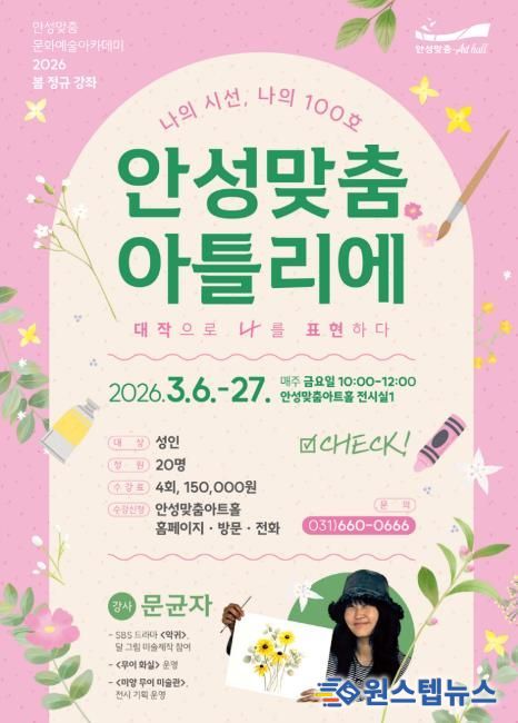원스텝뉴스 이병희 기자 | 안성맞춤아트홀은 시민의 문화예술 향유 기회를 확대하고, 생애주기별 맞춤형 예술교육을 제공하기 위해 오는 3월 '2026 안성맞춤아트홀 문화예술 아카데미' 봄 정규 강좌를 운영한다고 밝혔다.
