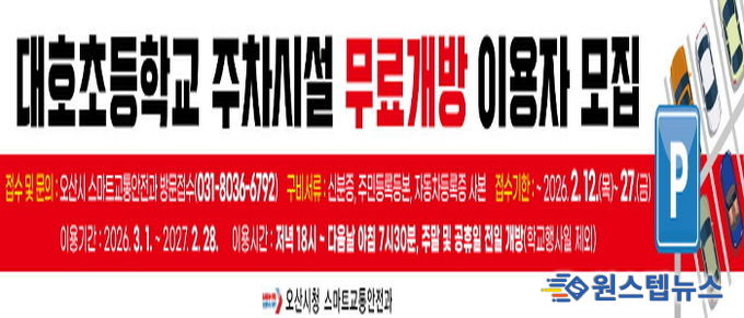 원스텝뉴스 이병희 기자 | 오산시는 오는 2월 12일부터 27일까지 ‘대호초등학교 주차시설 무료개방’ 사업의 2년 차 이용자를 모집한다고 밝혔다.