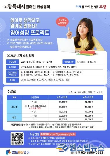 원스텝뉴스 이병희 기자 | 고양특례시는 2월 11일 접수를 시작으로 3월 12일까지 ‘2026년 2기 원어민 화상영어’수강생을 모집한다고 밝혔다.