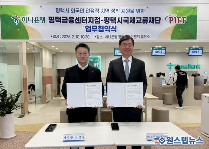 원스텝뉴스 이병희 기자 | 평택시국제교류재단은 지난 10일 오전 10시 30분, 하나은행 평택외국인센터 출장소 로비에서 하나은행 평택금융센터지점과 외국인의 안정적인 지역 정착지원을 위한 상호협력 업무협약(MOU)을 체결했다.