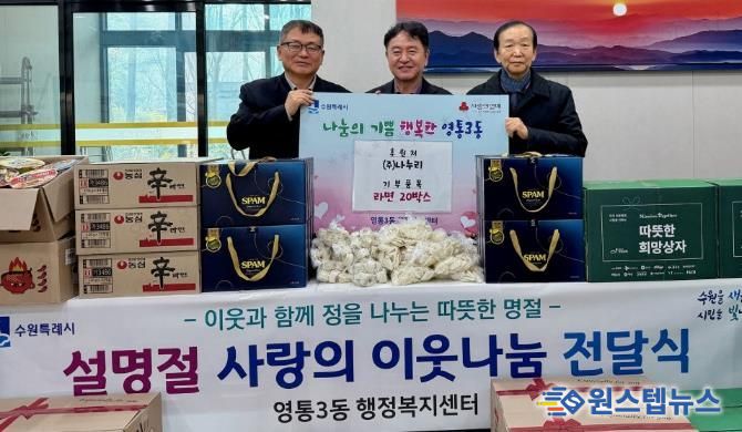 김인태 영통3동장은 “설 명절을 앞두고 지역 이웃을 위한 나눔에 함께해주신 ㈜나누리에게 감사드린다. 기탁물품은 도움이 필요한 이웃들에게 잘 전달될 수 있도록 하겠다”고 말했다.