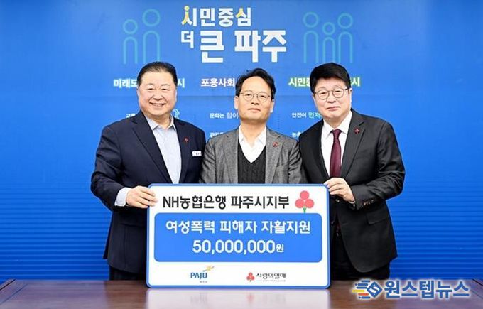 원스텝뉴스 이병희 기자 | 파주시는 지난 11일 엔에이치(NH)농협은행 파주시지부가 여성폭력 피해자의 자립과 회복을 지원하기 위한 후원금 5천만 원을 기탁했다고 밝혔다.