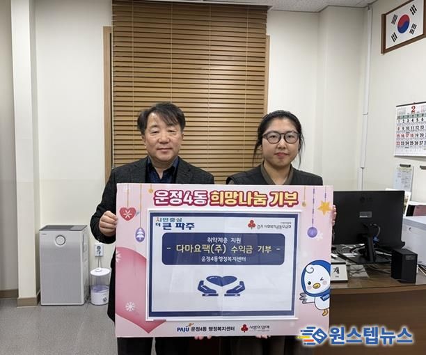 원스텝뉴스 이병희 기자 | 파주시 운정4동은 설 명절을 맞아 지난 10일 파주시 관내 중소기업인 다마요팩㈜으로부터 취약계층을 위한 이웃 돕기 성금을 기탁 받았다고 밝혔다.