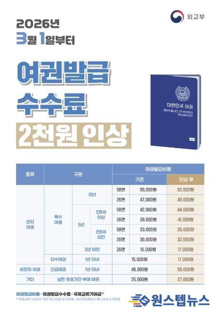 원스텝뉴스 이병희 기자 | 외교부의 여권법 시행령 개정으로 오는 3월 1일부터 여권 발급 수수료가 2천원 인상된다. 유효기간 10년 복수여권의 경우 58면 기준 5만원에서 5만2천원으로, 26면 기준 4만7천원에서 4만 9천원으로 변경 예정이다.
