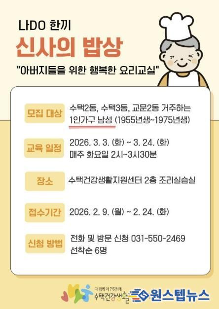 원스텝뉴스 이병희 기자 | 구리시 수택건강생활지원센터는 오는 2월 24일까지 관내 1인 가구 남성을 위한 체험형 건강 식생활 프로그램인 ‘나DO한끼 신사의 밥상’ 참여자를 모집한다고 밝혔다.