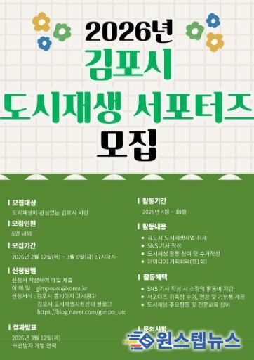 원스텝뉴스 이병희 기자 | 김포시는 다양한 도시재생사업을 홍보하고 도시재생에 대한 시민들의 이해와 관심을 도모하고자 오는 12일부터 ‘2026년 김포시 도시재생 서포터즈’를 모집한다.