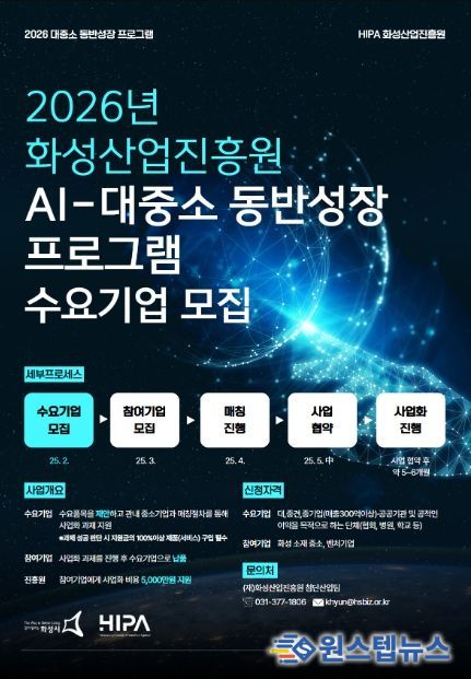 원스텝뉴스 이병희 기자 | 화성산업진흥원은 AI 기술 사업화 협력을 통해 산업 전반의 경쟁력을 높이기 위해 오는 2월 25일까지 ‘2026년 AI-대중소 동반성장 프로그램’ 수요기업을 모집한다고 밝혔다.