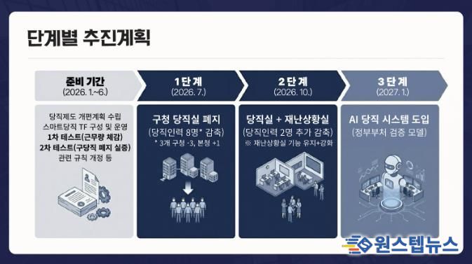 시는 올해 상반기를 사전 준비 기간으로 정하고, 8개 부서가 참여하는 AI 당직 전담조직(TF)을 구성하고 시·구청 당직 통합 시 근무량을 검증했다. 다음 달에는 구청 당직 폐지 시 예상되는 시민 불편과 사각지대를 시뮬레이션 방식으로 점검하고, 5월까지 조례·규칙 개정과 법제 심사를 마쳐 제도적 기반을 마련할 예정이다.