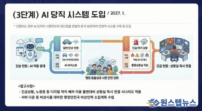 내년 1월부터는 3단계 ‘AI 당직 시스템’을 본격 가동한다. 야간시간 처리가 불가능한 단순 부서 이관 민원 등은 AI 보이스봇이 24시간 자동 접수하고, 긴급 상황·복합 민원은 즉시 통합상황실로 자동 연동되는 AI-인간(Human) 협업 방식이다. 노령층 등 디지털 약자를 위한 즉시 연결 서비스와 장애 대비 비상 인력 체계도 마련한다.