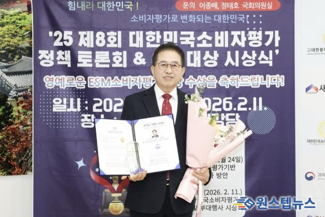 원스텝뉴스 이병희 기자 | 지난 11일, 국회 도서관에서 열린 2026 제8회 ESM대한민국소비자평가우수대상 정책토론회 및 시상식에서 광주시의회 허경행 의장이 지방자치/행정 부문 대상을 수상했다.