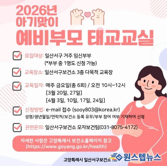 원스텝뉴스 이병희 기자 | 고양특례시 일산서구보건소는 2026년 아이를 맞이하는 예비부모의 건강한 임신과 출산을 위해 ‘예비부모 태교교실’을 운영한다.