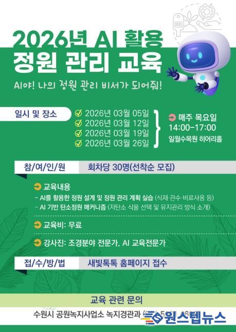 생성형 인공지능(AI) 교육 전문가와 조경·정원 분야 전문 강사진이 이론과 사례를 중심으로 강의한다. 수강을 원하는 시민은 수원시 시민참여 플랫폼 ‘새빛톡톡’에서 신청하면 된다. 선착순 모집이다.