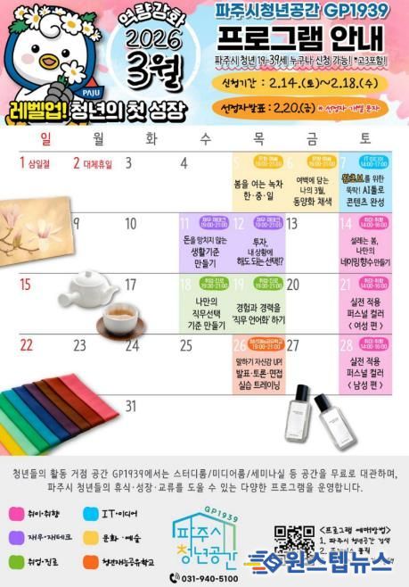 3월 프로그램 참여자 모집은 2월 14일부터 2월 18일까지 진행되며, 네이버 플레이스를 통해 신청할 수 있다. 선정 결과는 2월 20일 개별 문자로 안내된다. 프로그램별 일정과 세부 내용은 ‘네이버플레이스’및 ‘파주시 청년포털’에서 확인 가능하다.