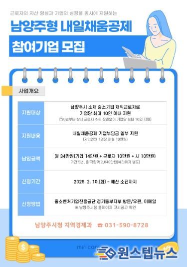 원스텝뉴스 이병희 기자 | 남양주시는 관내 중소기업 핵심 인력의 장기근속 유도와 고용 확대를 위해 ‘2026년 남양주형 내일채움공제’지원사업 참여기업을 모집한다고 13일 밝혔다.