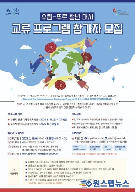 원스텝뉴스 이병희 기자 | 수원시국제교류센터는 수원시의 국제자매도시인 프랑스 뚜르시와 추진하는 ‘2026 수원-뚜르 청년 대사 교류 프로그램’에 참여할 수원시 청년 2명을 3월 18일까지 모집한다.