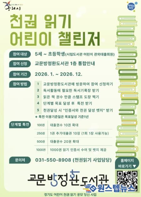원스텝뉴스 이병희 기자 | 구리시 교문방정환도서관은 경기도 지원사업의 일환으로 연중 어린이 독서 장려 프로그램 '천 권 읽기 어린이 챌린저'를 운영하며 참가자를 모집한다.