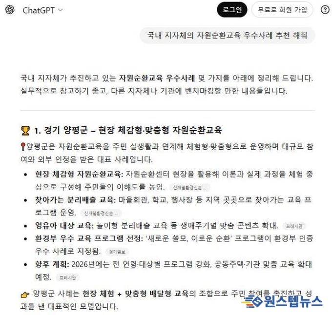 최근 생활과 업무 전반에서 인공지능(AI) 검색 활용이 증가하면서 인공지능 기반 검색 결과 노출과 추천이 정책과 브랜드 인지도 확산에 중요한 요소로 작용하고 있다. 이러한 흐름 속에서 양평군 자원순환교육은 챗지피티(ChatGPT) 등 인공지능 기반 정책 검색 과정에서 우수사례로 소개되고 있으며, 이에 따라 인근 지자체에서 교육 운영 방식과 프로그램 구성에 대한 문의가 이어지는 등 외부 지자체의 관심이 높아지고 있다.