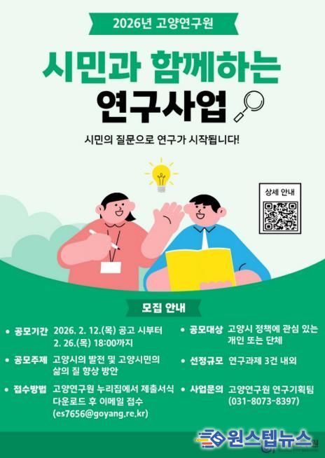 원스텝뉴스 이병희 기자 | 고양연구원은 시민과 함께 고양시의 미래를 설계하는 문제해결형 연구를 추진하기 위해 ‘시민과 함께하는 연구사업’ 공개 모집을 오는 2월 26일까지 진행한다.