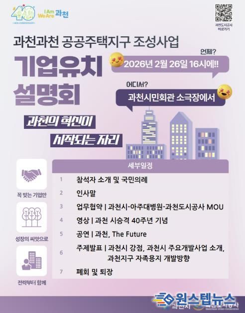 원스텝뉴스 이병희 기자 | 과천시와 과천도시공사는 오는 2월 26일 오후 4시 과천시민회관 소극장에서 ‘과천과천 공공주택지구 기업유치 설명회’를 개최한다고 밝혔다.