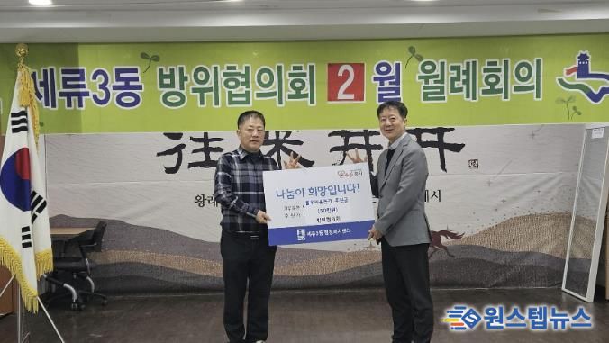 원스텝뉴스 이병희 기자 | 수원시 권선구 세류3동 방위협의회는 지난 12일, 세류3동행정복지센터를 방문해 불우이웃 돕기 후원금 50만 원을 기탁했다.