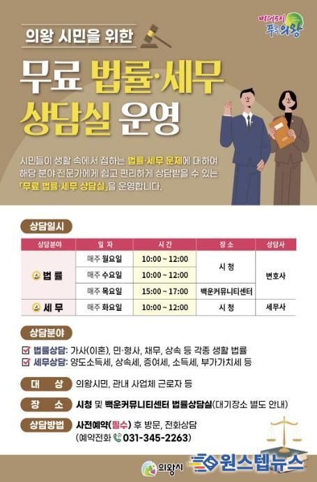 원스텝뉴스 이병희 기자 | 의왕시가 시민들의 생활 속 법률·세무 고민 해결을 위한 ‘무료 법률‧세무 상담실’을 연중 운영하고 있다.
