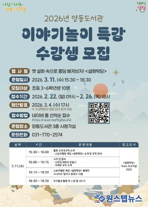 원스텝뉴스 이병희 기자 | 양평군은 새 학기를 맞아 양동도서관에서 초등학생을 대상으로 운영하는 ‘이야기 놀이 특강’의 수강생을 오는 22일부터 26일까지 모집한다고 밝혔다.