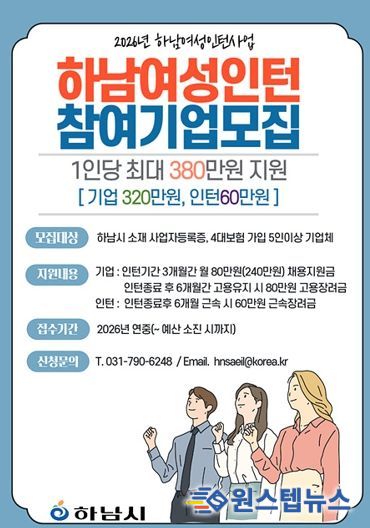 원스텝뉴스 이병희 기자 | 하남시는 관내 여성 구직자의 경제활동 참여를 확대하고 기업의 인력 채용을 지원하기 위해 ‘2026년 하남여성인턴 사업’을 추진한다고 밝혔다.