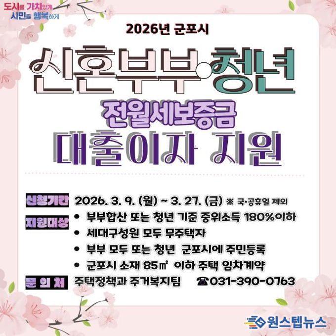 원스텝뉴스 이병희 기자 | 군포시가 신혼부부와 청년들의 주거비 부담 경감과 안정적인 거주환경을 위해 2026년 군포시 신혼부부 및 청년 전월세 보증금 대출이자 지원사업 대상자를 모집한다고 밝혔다.