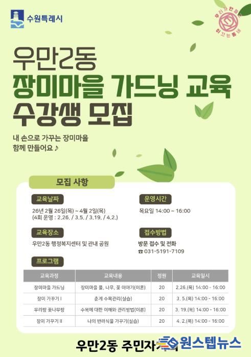 원스텝뉴스 이병희 기자 | 수원시 팔달구 우만2동은 장미·식물 가드닝에 관심 있는 모든 주민에게 도움이 될 ‘장미마을 가드닝 교육’ 수강생을 모집한다고 밝혔다.