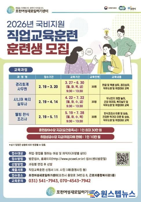 원스텝뉴스 이병희 기자 | 포천여성새로일하기센터는 취업과 창업을 희망하는 여성을 대상으로 ‘2026년 직업교육훈련생’을 모집한다.