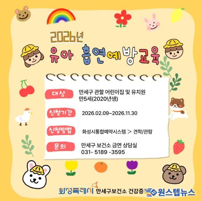 원스텝뉴스 이병희 기자 | 화성특례시 만세구보건소는 관내 유치원과 어린이집 만 5세 유아를 대상으로 올해 3월부터 11월까지 흡연 예방 교육을 운영한다고 밝혔다.