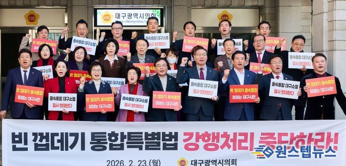 원스텝뉴스 이병희 기자 | 대구광역시의회는 2월 23일 오전 11시, 대구시의회 1층 현관에서 대구경북 행정통합 졸속 추진 규탄 성명서를 발표했다.
