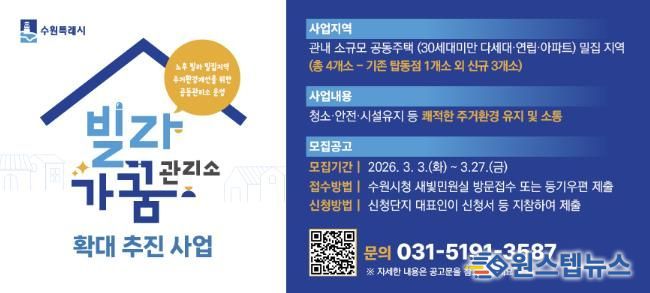 원스텝뉴스 이병희 기자 | 수원특례시는 노후 빌라 밀집지역을 체계적으로 관리하고, 주거환경을 개선하는 ‘2026년 빌라가꿈관리소 확대 추진사업’의 대상지 신청을 3월 27일까지 받는다.