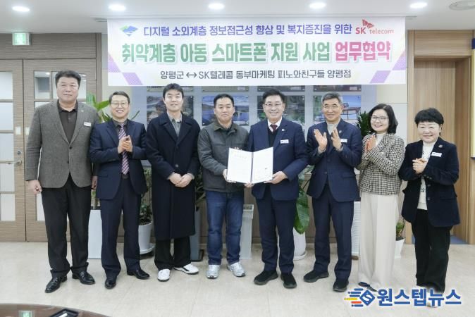 원스텝뉴스 이병희 기자 | 양평군은 지난 23일 SK텔레콤 동부마케팅 ‘피노와친구들’ 양평점과 ‘취약계층 아동 스마트폰 지원 사업’의 원활한 추진을 위한 업무협약을 체결했다고 밝혔다.