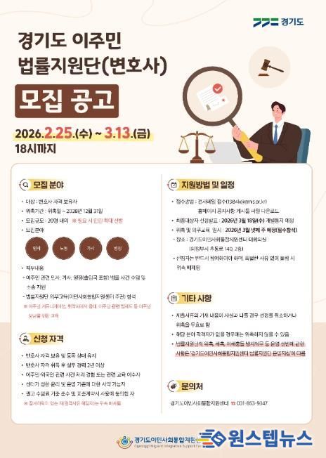 원스텝뉴스 이병희 기자 | 경기도는 3월 13일까지 ‘경기도 이주민 법률지원단 지원사업’에 참여할 변호사를 모집한다.