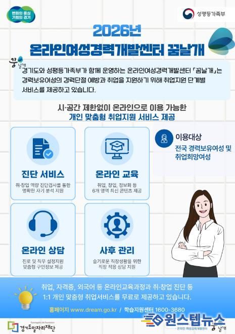 원스텝뉴스 이병희 기자 | 경기도가 경력보유여성 등 미취업여성의 경력단절을 예방하고 경제활동 참여를 지원하기 위해 ‘온라인 여성경력개발센터(꿈날개)’ 사업을 추진한다.