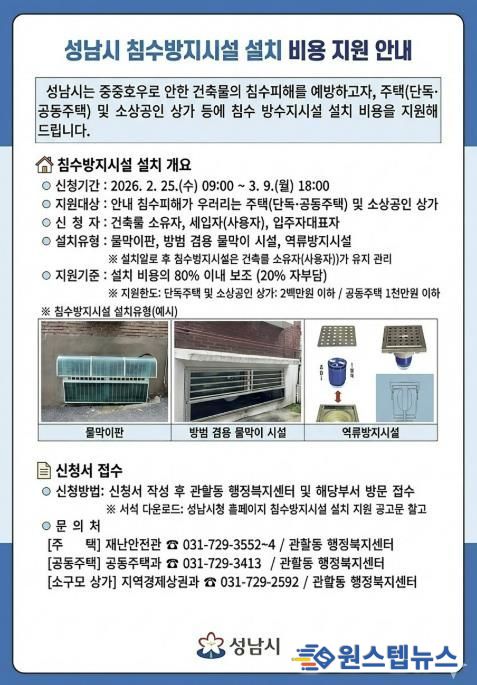 원스텝뉴스 이병희 기자 | 성남시는 여름철 집중호우로 인한 주택과 상가의 침수 피해를 사전에 예방하기 위해 침수방지시설 설치 비용을 최대 80%까지 지원한다.