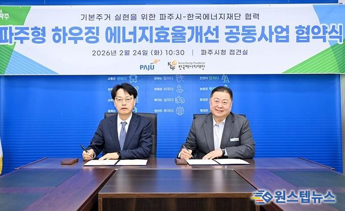 원스텝뉴스 이병희 기자 | 파주시는 지난 24일 한국에너지재단과 ‘기본주거 실현을 위한 파주형 하우징 에너지효율개선 공동사업’업무협약을 체결했다.