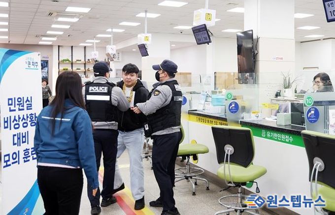 훈련은 실제 돌발 상황을 가정해 진행됐으며, ▲민원인 폭언 발생 시 폭언 중단 및 진정 요청(상급자 개입) ▲사전 고지 후 현장 녹화·녹음 실시 ▲비상벨 호출 및 청원경찰 제지 ▲피해 공무원 보호와 방문 민원인 대피 ▲민원인 제압 및 출동 경찰 인계 등 전담반별 역할 분담과 임무에 대한 숙지 여부를 집중적으로 점검했다.