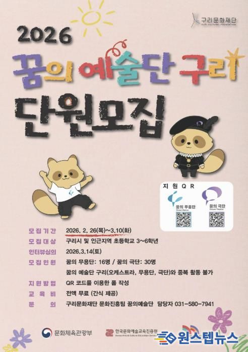 원스텝뉴스 이병희 기자 | 구리문화재단은 구리시 관내 아동·청소년들이 예술적 상상력을 펼치고 주체적으로 성장할 수 있도록 지원하는 ‘2026 꿈의 예술단 구리’(극단·무용단) 신입 단원을 2월 26일부터 모집한다고 밝혔다.