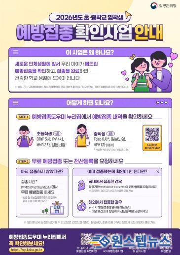 초등학교 입학생은 ▲디프테리아/파상풍/백일해(DTaP) 5차▲폴리오(IPV) 4차 ▲홍역/유행성이하선염/풍진(MMR) 2차 ▲일본뇌염(불활성화백신 4차 또는 약독화 생백신 2차) 백신 등 4종이 대상이다.