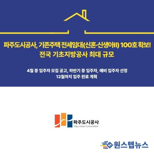 원스텝뉴스 이병희 기자 | 파주도시공사는 지난 25일 ‘기존주택 전세임대(신혼·신생아Ⅱ유형)’ 사업 물량 100호에 대한 공급계획 승인신청서를 국토교통부에 제출했다고 밝혔다.