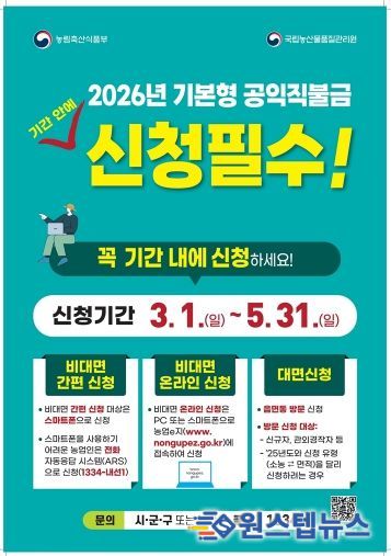 원스텝뉴스 이병희 기자 | 의정부시는 3월부터 ‘2026년 기본형 공익직불금’ 신청을 접수한다고 26일 밝혔다.