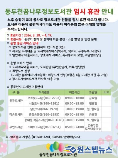 원스텝뉴스 천규영 기자 | 동두천시 도서문화사업소 꿈나무정보도서관은 노후 승강기 교체 공사 시행에 따라 오는 3월 20일부터 4월 19일까지 임시 휴관한다고 밝혔다.