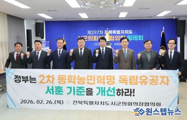 원스텝뉴스 이병희 기자 | 전북특별자치도시군의회의장협의회(회장 남관우 전주시의회 의장)는 26일 순창군의회에서 열린 제297차 월례회에서 2차 동학농민혁명 참여자 독립유공자 서훈 인정 법령 개정 및 '지방의회법'제정을 촉구했다.