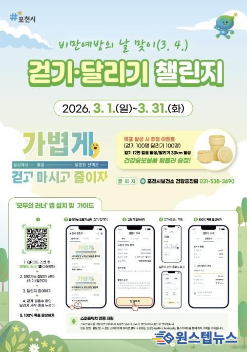 원스텝뉴스 이병희 기자 | 포천시는 오는 3월 4일 ‘비만예방의 날’을 맞아 '비만예방의 날 맞이 걷기·달리기 챌린지 및 합동캠페인'을 3월 한 달간 운영한다.