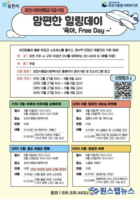 모집 대상은 포천시에 거주하거나 근무 중인 미성년 자녀를 양육하는 30~40대 여성으로, 매월 10명씩 총 40명을 선착순으로 모집한다. 세부 일정과 신청 방법은 포천시종합사회복지관 공식 누리소통망 및 누리집을 통해 확인할 수 있다.