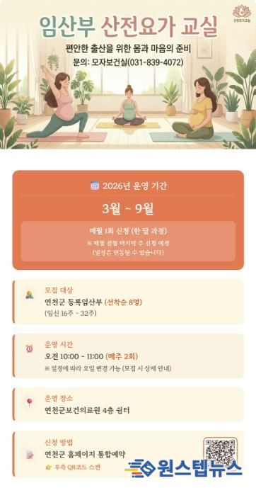 원스텝뉴스 이병희 기자 | 연천군보건의료원은 저출생 위기 극복과 관내 임산부들의 건강한 출산을 돕기 위해 오는 3월부터 ‘2026년 임산부 산전요가 교실’을 본격적으로 운영한다고 밝혔다.