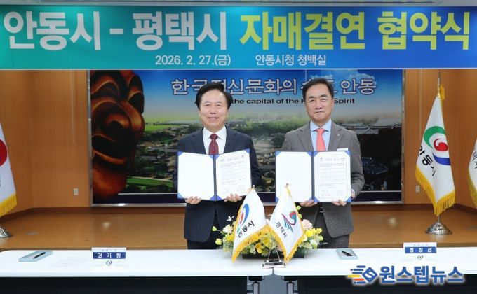 원스텝뉴스 이병희 기자 | 경기도 평택시와 경상북도 안동시가 27일, 안동시청에서 자매결연 협약식을 갖고 상호 신뢰와 협력을 바탕으로 행정, 경제, 문화, 관광, 농업 등 다양한 분야의 교류 확대를 약속했다.